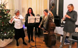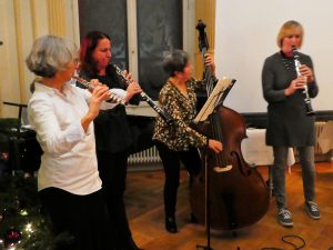 Es begann in einer kleinen Formation. Gaby Lang Klavier und Irene Studer an der Querflöte. Doch plötzlich packten auch Karin, Ursula und Nicole ihre Instrumente aus, so dass sich die kleine Formation zu einem Quintett entwickelte. Musik und das Singen der Weihnachtslieder erfüllten den Raum. In der Ecke glitzerte der Weihnachtsbaum und auf den Tischen die Weihnachtsdekoration. Welch festlicher Anlass!
